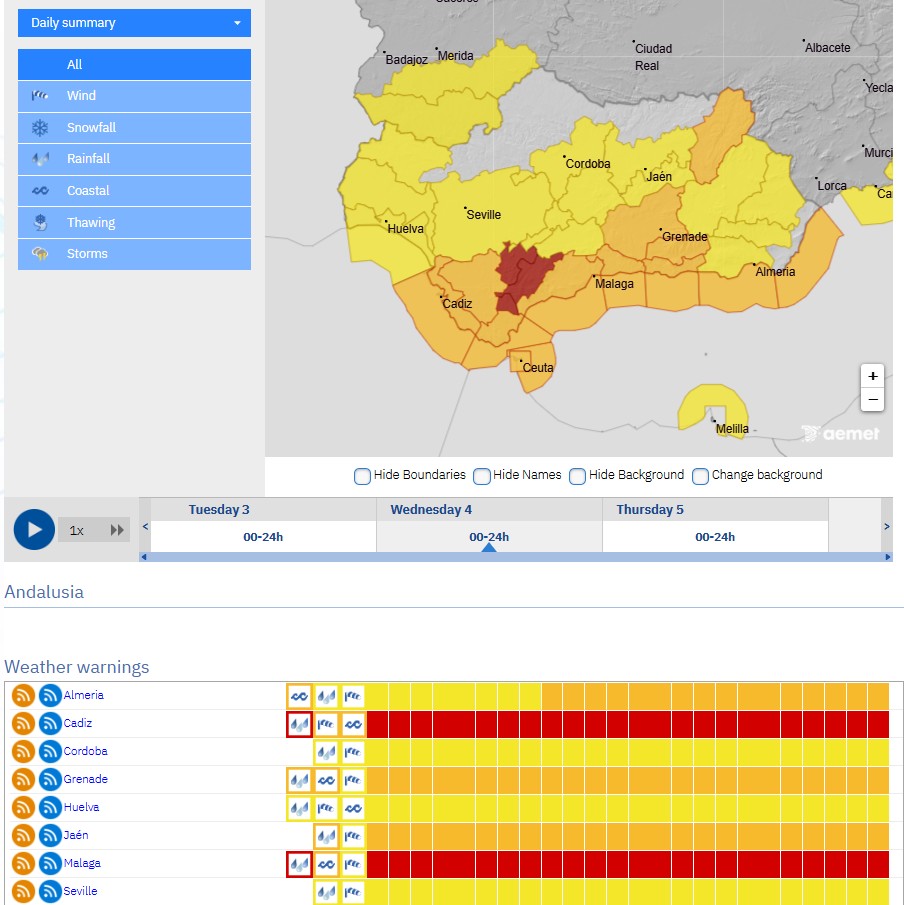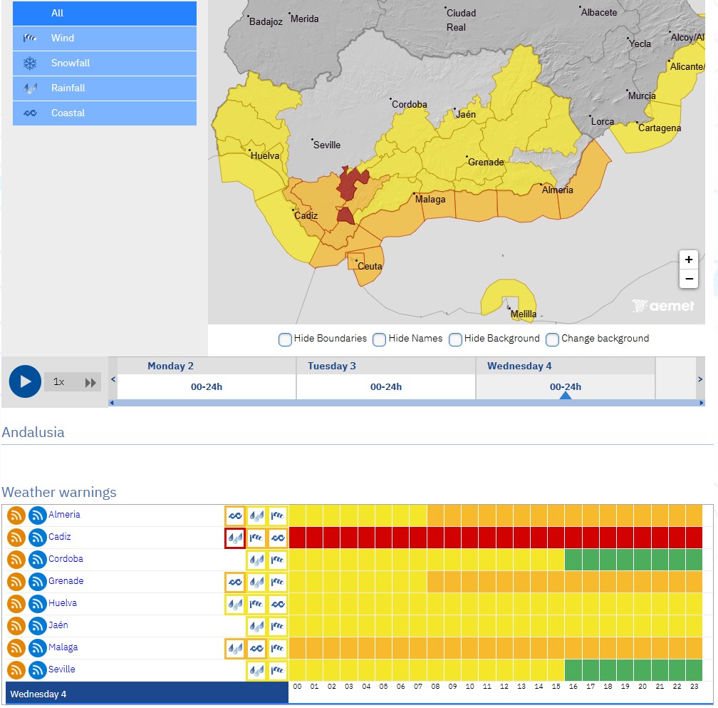– Andalusian President Juanma Moreno has mobilised the Military Emergency Unit and ordered an ES-ALERT message from 8:00 p.m. to residents in high-risk areas. AEMET also warns of a strong maritime storm with westerly winds of 60 to 75 km per hour and waves exceeding 5 metres, lasting until Thursday noon. The heaviest rain is expected in Grazalema, the Serranía de Ronda, and the Strait of Gibraltar, where totals could reach 200 to 250 litres in 24 hours.