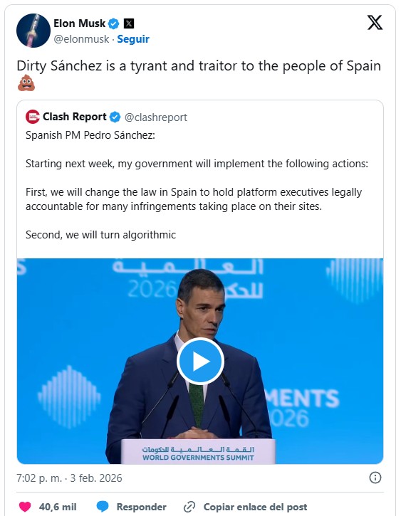 – In the message, the owner of SpaceX and Tesla referred to the President of the Government as “Dirty Sánchez”, alluding to the slang term for a peculiar coprophilic sexual practice. Finally, he added a poo emoji. Source, Spanish: https://www.20minutos.es/internacional/musk-arremete-contra-sanchez-por-limitar-acceso-menores-las-redes-dirty-sanchez-es-un-tirano-un-traidor-los-espanoles_6929547_0.html & X Link