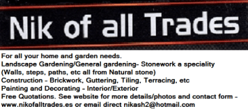 Services Available for home, garden and office by Nik of all Trades: Gardening – from weeding to landscaping, stonework (walls, paths, steps, etc) a speciality. Transport and tools all provided by me, no job too small or too big as I have others to call on if required, from 10€ per hour per man plus 10€ plus any required materials at cost or fixed price quote if you prefer.
