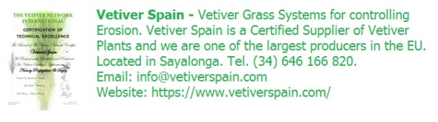 Vetiver Spain: We are a Certified Supplier of Vetiver Plants and we are one of the largest producers in the EU. We have been growing Vetiver for over 8 years now. We can help you with the design of your project and show you many examples of erosion that we have experienced on our own property. On our land and in our Greenhouses we have over 1 million plants and that number is constantly growing. We can provide individual slips or more mature plants of various sizes. We have trays of plants in 18 or 24 compartment configuration. We also have plants in tall plastic pots and grow bags. View our website for examples. We can easily provide in excess of 10,000 plants per week and can arrange special pricing and delivery as needed. We also work with a number of qualified Landscaping companies to help in planting. Please contact us with any questions. UK Vetiver retailers have been supplied by us here in Spain.