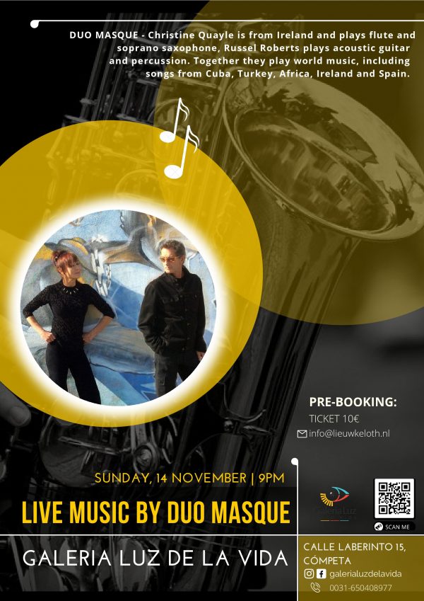 The 14th of November in the evening at 9pm Duo Masque will play live world music in Galeria Luz de la Vida in Competa. The galeria is a perfect spot for live music, great intimate ambiance in an authentic space.