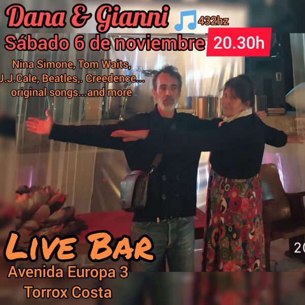 Dana & Gianni in concert: Live Bar- Torrox Costa. Saturday 6th of November starting at 20.30 you can take part in the musical journey around the world. A refined selection of magnificent songs by Tom Waits, Nina Simone, Beatles, Creedence and much more, besides their own songs, interpreted in a unique and passionate way. You can’t miss it! We are waiting for you at the Live Bar, Avenida Europa 3 Torrox Costa, starting at 20.30. For a cocktail, a beer, and special tapas. Reserve already! 642 47 25 92