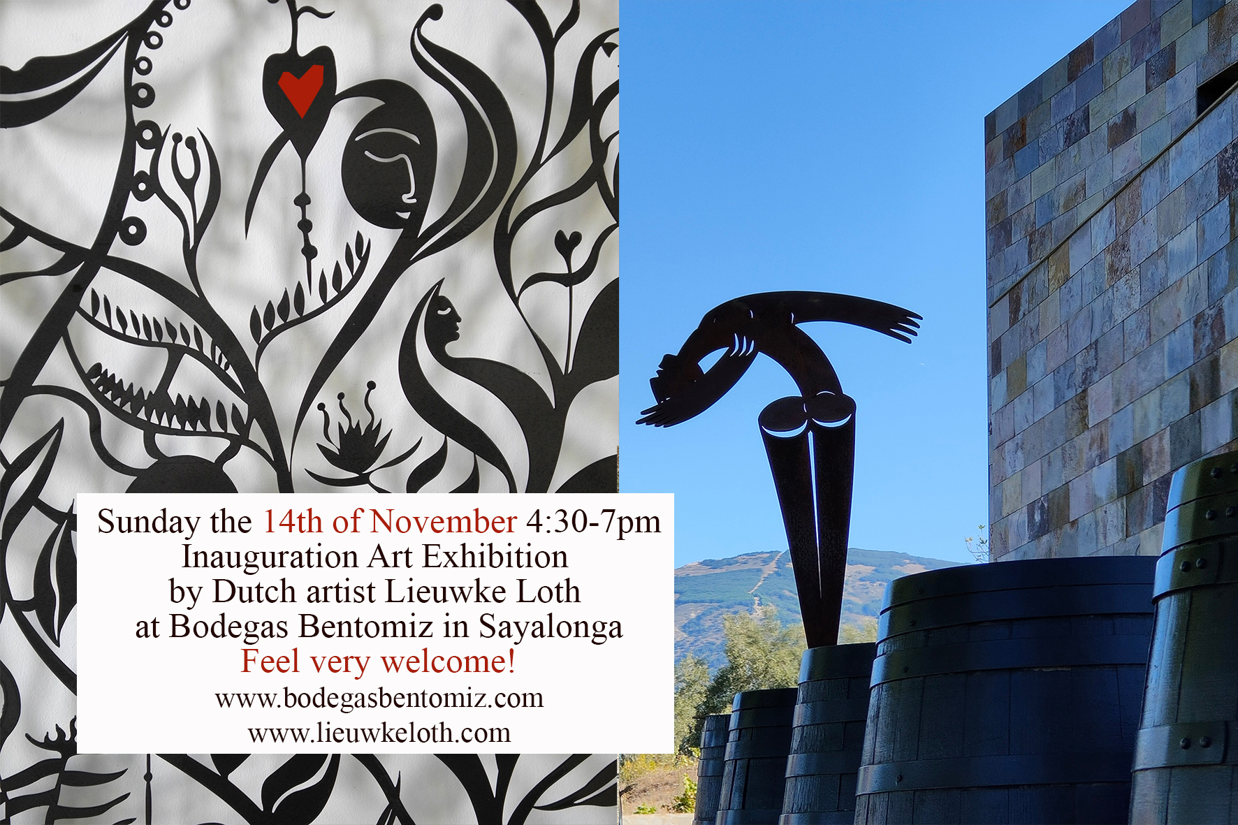 This month Lieuwke Loth her art can not only be seen in Galeria Luz de la Vida in Competa, but also at the well known restaurant Bodegas Bentomiz in Sayalonga! Dutch couple André and Clara began making wine in the late 1990s. Impressed by the quality of the exceptional local grapes they turned their hobby into a business (2004) and Bodegas Bentomiz was born. They produce a varied range of exquisite wines with the common theme of being elegant, fresh and subtle. Since André is a civil engineer, it is no surprise the Bodega building is spectacular: special for its design but integrating perfectly in its natural surroundings. Clara and André are delighted to host the works of Dutch artist Lieuwke Loth.