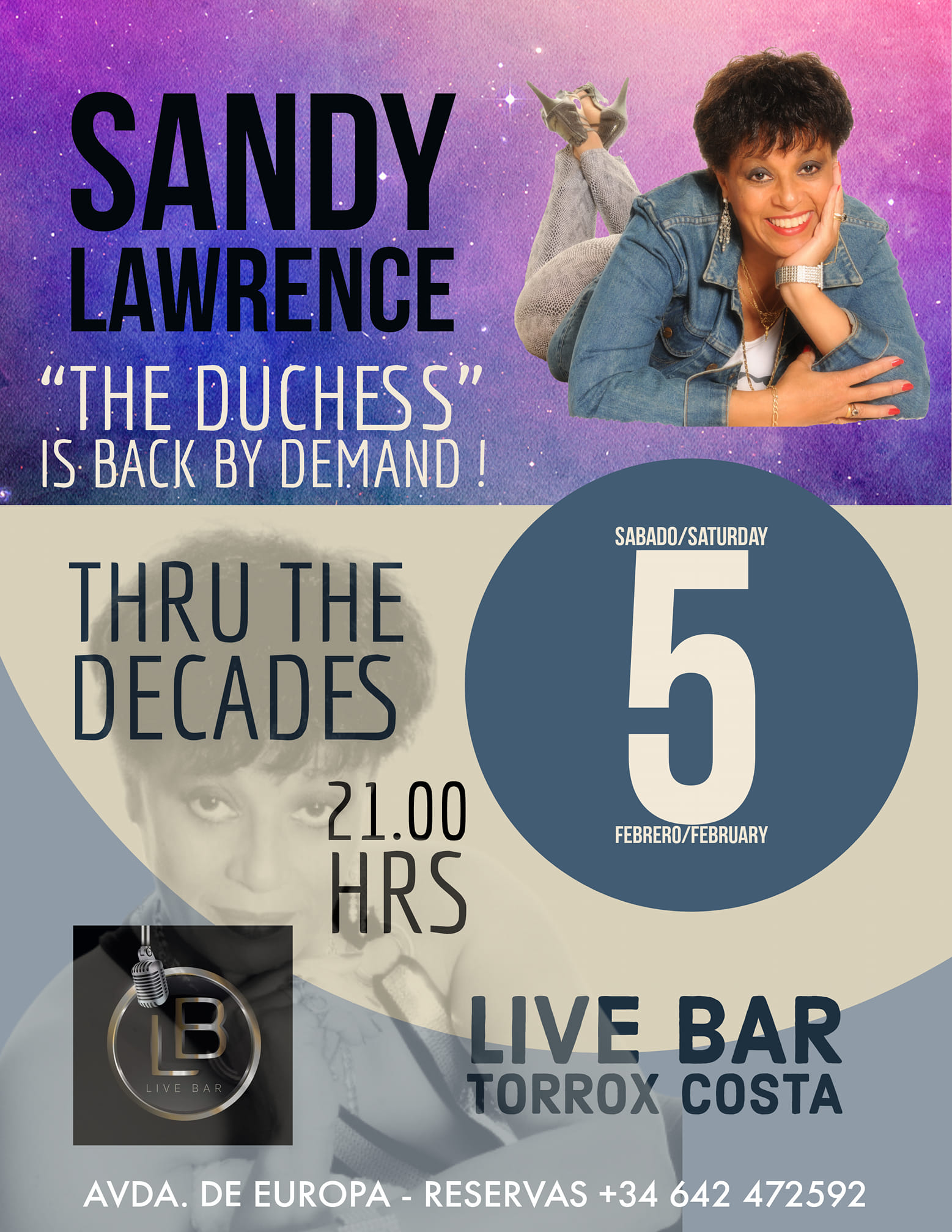 Live Bar- Torrox Costa: Sandy Lawrence, Sat., Feb 5th, 9pm performing her show, “Thru The Decades”. Av de Europa, Torrox Costa. Res 642 472 592