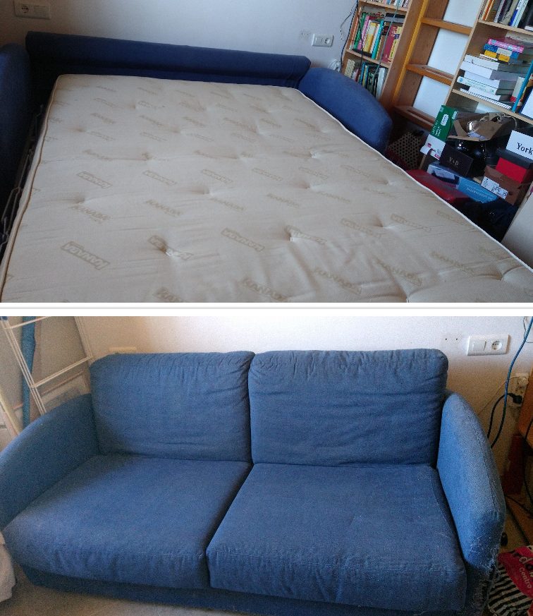 For Sale: Sofa bed. Double blue sofa bed, fully sprung base and sprung mattress. Mattress 140cms x 190cms. Only used a couple of times in spare room. Excellent condition but some cat scratch damage on corner of arm. Space needed. Very heavy will need two people to take away. Bargain €75. Sylvia / Arenas near Velez Malaga