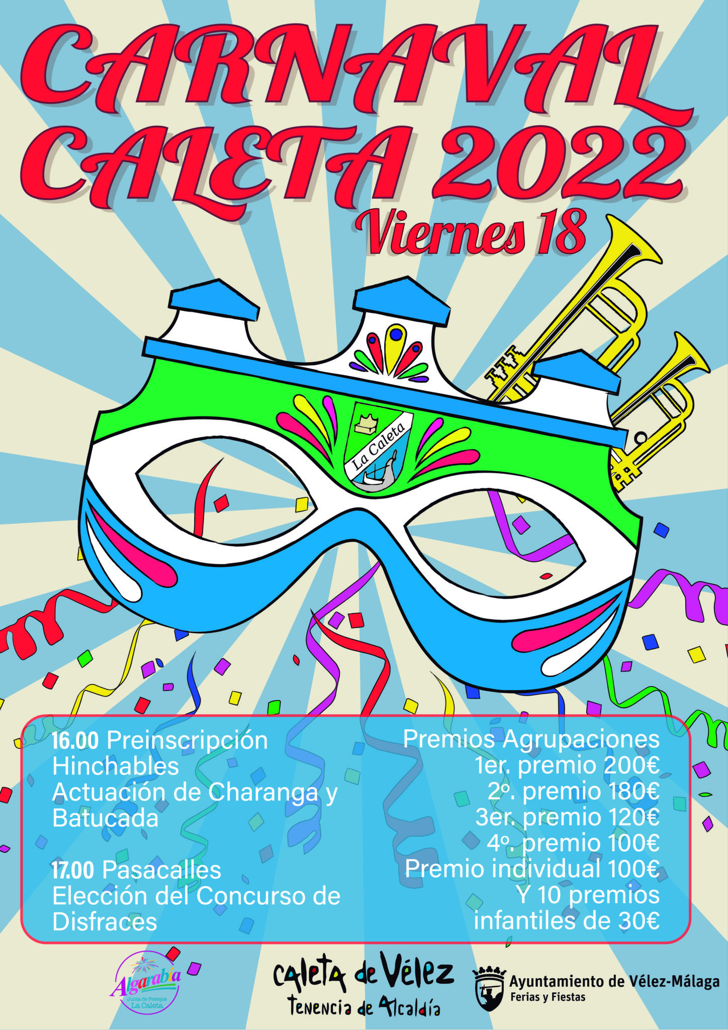 Carnival Caleta de Velez: {Translation} Friday 18th February with a pre-registration from 16.00 to 17.00 hours in Colonias del Puerto III, a parade at 17.00 hours and a tour around the village of La Caleta de Vélez. There will be novelties, such as the performance of a batucada and the traditional charanga company. On the other hand we will have one of the floats of our sea parade and numerous groups that have confirmed their attendance in the parade. Source, Spanish: https://www.axarquiaplus.es/la-caleta-de-velez-presenta-el-nuevo-programa-para-la-vuelta-del-carnaval-a-sus-calles/