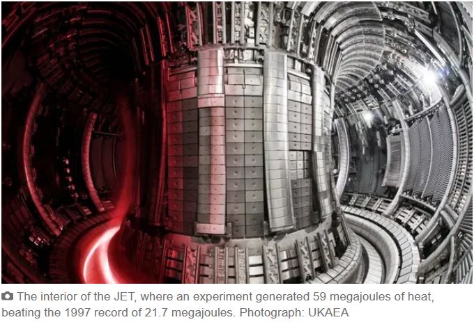 Researchers at the Joint European Torus (JET), a fusion experiment in Oxfordshire, generated 59 megajoules of heat – equivalent to about 14kg of TNT – during a five-second burst of fusion, more than doubling the previous record of 21.7 megajoules set in 1997 by the same facility.