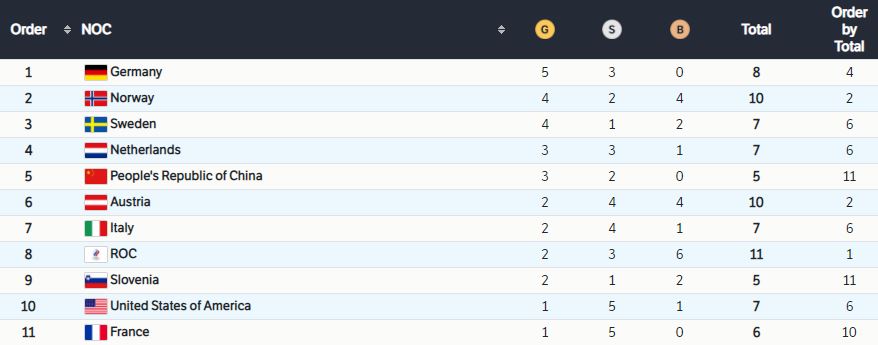 Olympic Medal Table, Wed., Feb 9th 2022: Click/tap the pic to enlarge. See Beijing Winter Olympics 2022 info site, has full schedules & scores: https://olympics.com/en/