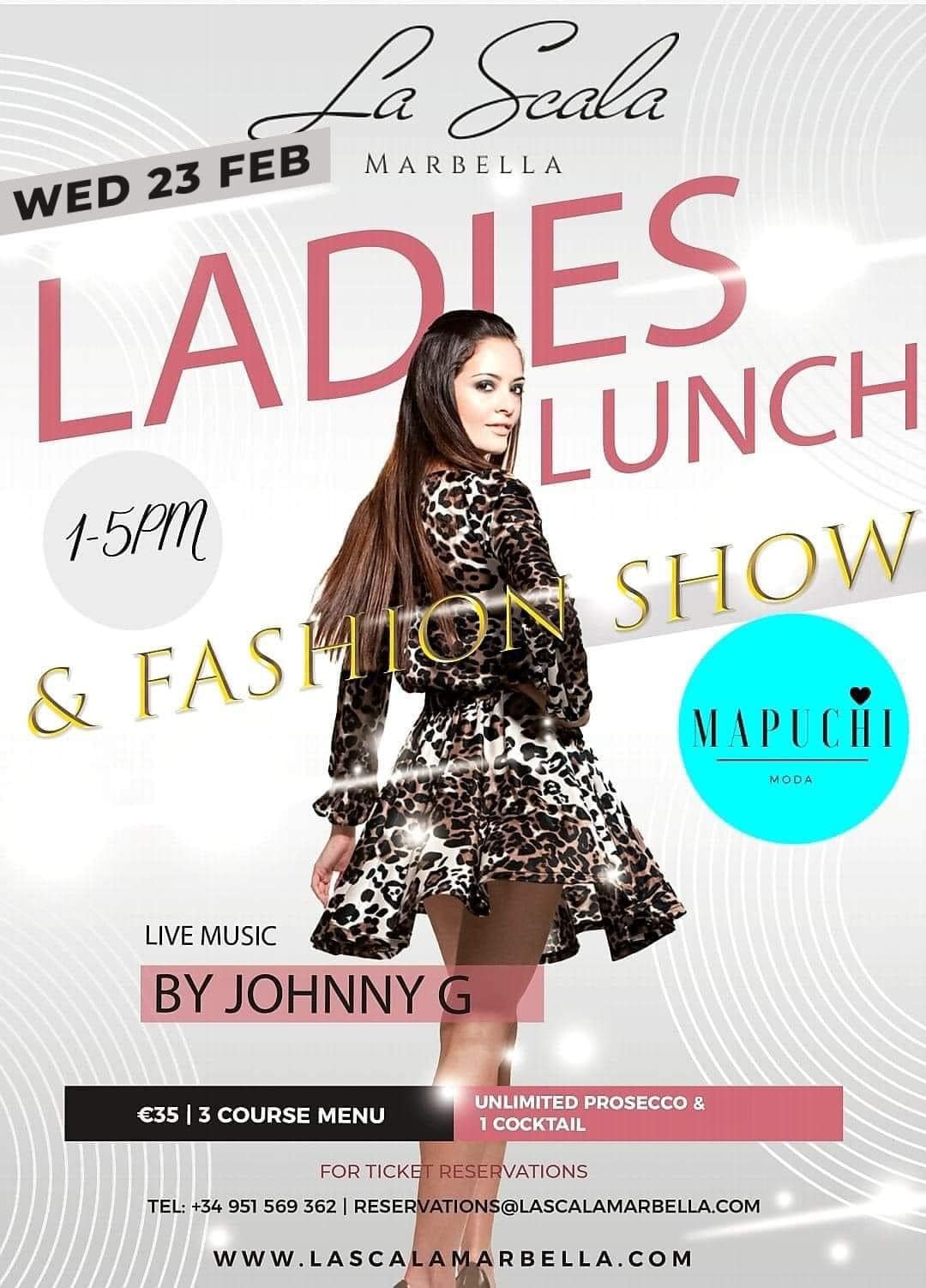 Wed. 23Feb from 1pm La Scala Marbella have a Fashion Show by Mapuchi Moda whilst enjoying a 3 course menu with unlimited Prosecco & one cocktail from only €35 while enjoying live music with Johnny G. Tel 951 569 362 Make sure to reserve your table because these ladies lunches are very popular! See you there ladies! Menu at www.lascalamarbella.com