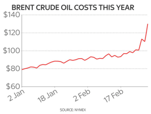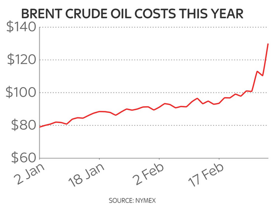 Cost of natural gas has smashed past UK records while Brent crude oil has surged to its highest level since 2008: The international oil benchmark passed $139 a barrel early on Monday – with its US counterpart also rising sharply – before settling back to around $121 by the afternoon. Full article: https://news.sky.com/story/ukraine-invasion-oil-costs-soar-to-2008-high-of-130-as-ban-on-russian-crude-is-considered-12559714