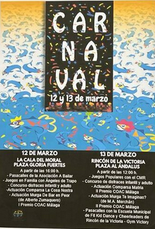 -On Saturday 12th March it will be the Plaza de Gloria Fuertes from 16:00, with parades by the Association A Bailar La Cala, family games with the company Ángeles de Trapo, performance of the troupe ‘La Cosa Nostra’, performance of the murga (street band) ‘De Bar en Peor’, by Alberto Zumaquero.