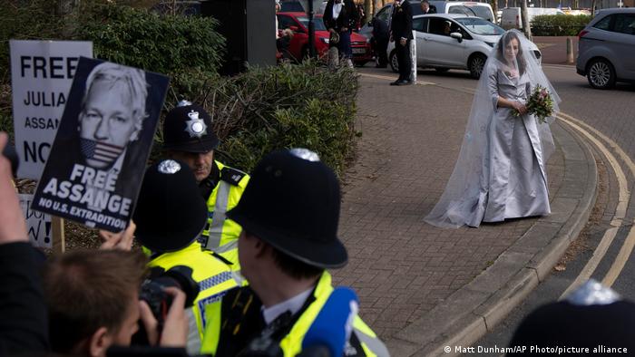 Julian Assange weds partner Stella Moris in prison: The jailed WikiLeaks founder and his long-term partner tied the knot in a high-security prison in London, reportedly with four guests and two witnesses. “No pictures of Julian Assange from today are available as prison authorities deemed images of the groom a ‘security risk,'” WikiLeaks wrote on Twitter. Photo info- Stella Moris posed without her husband as no pictures of Julian Assange were allowed. Full article: https://www.dw.com/en/julian-assange-weds-partner-stella-moris-in-prison/a-61238052