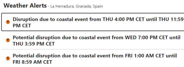 In the Axarquia and the Antequera areas, meanwhile, the warning will be yellow for up to 20mm of rain in one hour and an accumulation of up to 60mm in 12 hours. In addition, the yellow warning will be maintained for rough seas and high waves in the Axarquia, Costa del Sol and Guadalhorce weather forecasting zones, also until 8pm. Full article: https://www.surinenglish.com/malaga/amber-severe-weather-20220323075352-nt.html