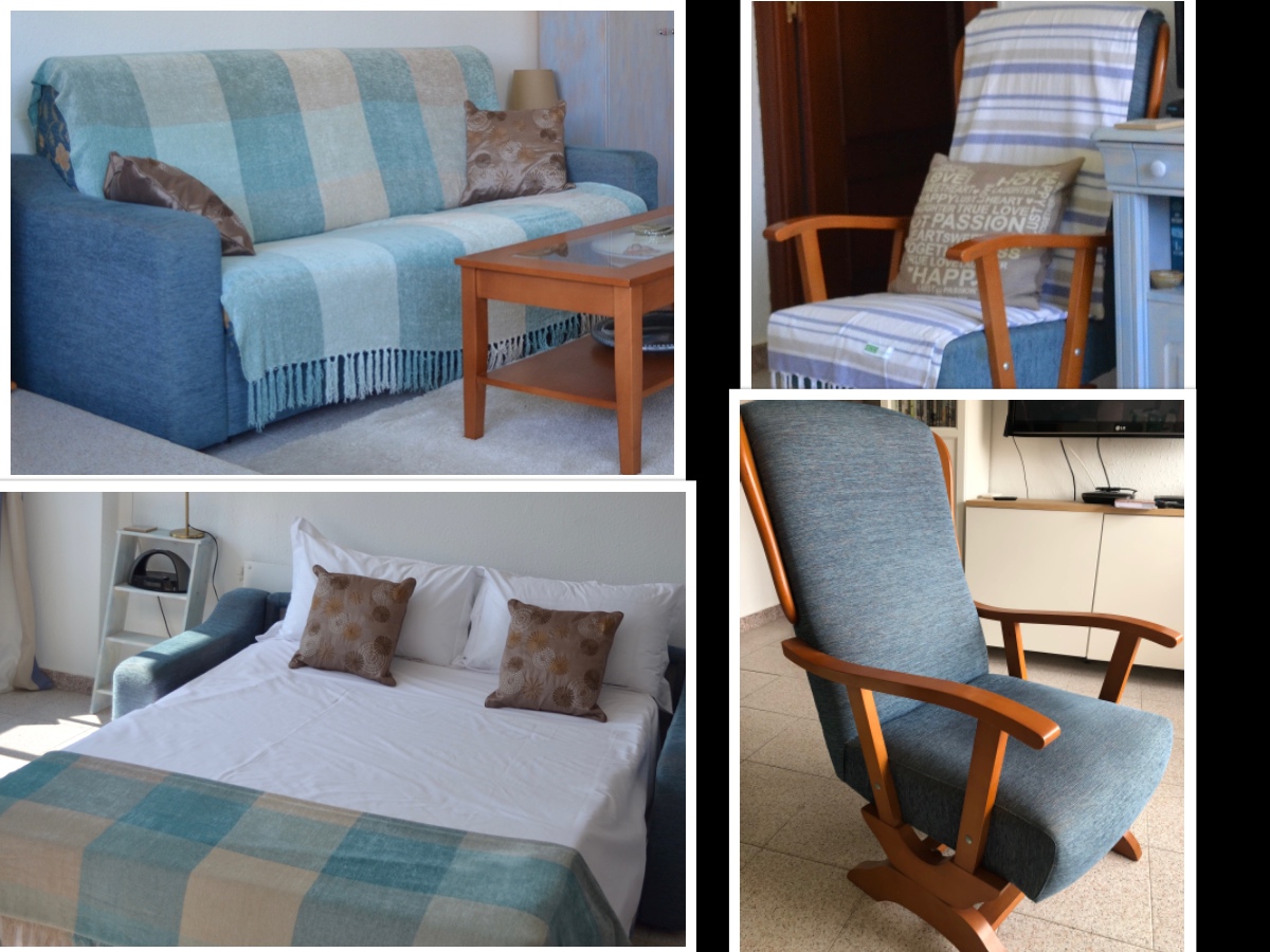 -Sofa bed – with quality mattress on metal fold out frame. All cushions attached so very easy to convert from sofa to bed. Throws used due to rental so still in good condition and very clean. Some wear on arms hence price – 85€