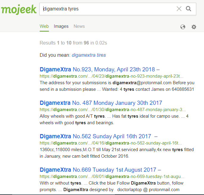 -Mojeek uses “site clustering” in its results. Site clustering looks at search results and when there are multiple results from the same website, it chooses the most relevant one and hides the rest. If you do a Mojeek search, after you see the results, if there are multiple results from the same website, you may be offered the option to click at the bottom left of the page where it will say “without site clustering” to expose many more results, all from the same websites already in the results. This provides a “cleaner” returns page, that is simple to expand with one click. I was not sure if I would like this, but I now find this very useful. See pics below with site clustering on top, and without below.