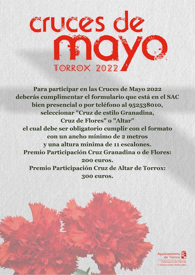 -There will be an official route to visit all the crosses and altars that have been registered, and a reward for each one’s involvement with 200 euros, if it is of crosses (regardless of style), and with 300 euros for each of the altars that meet more requirements. Signup in person at the SAC, or you can call the phone 95258010. https://www.facebook.com/AytoTorrox/posts/292286799734668
