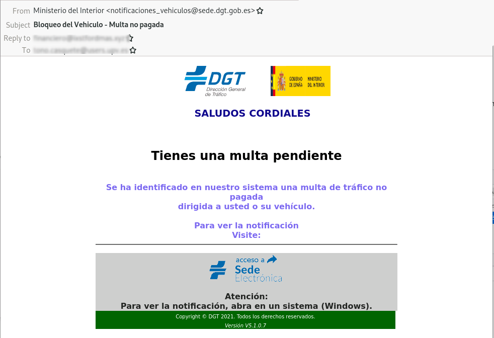Fraud warning- DGT is being spoofed by e-mail with the excuse of an unpaid fine: {Translation}