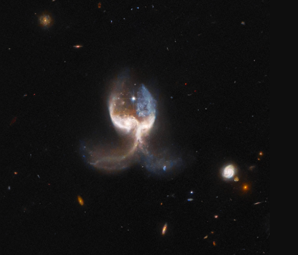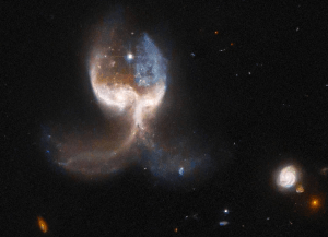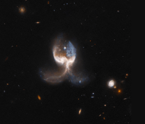 An Angel Wing in Space: This Hubble Space Telescope image features two merging galaxies in the VV-689 system, nicknamed the Angel Wing. Unlike chance alignments of galaxies, which only appear to overlap when viewed from our vantage point on Earth, the two galaxies in VV-689 are in the midst of a collision. The galactic interaction has left the VV-689 system almost completely symmetrical, giving the impression of a vast set of galactic wings.