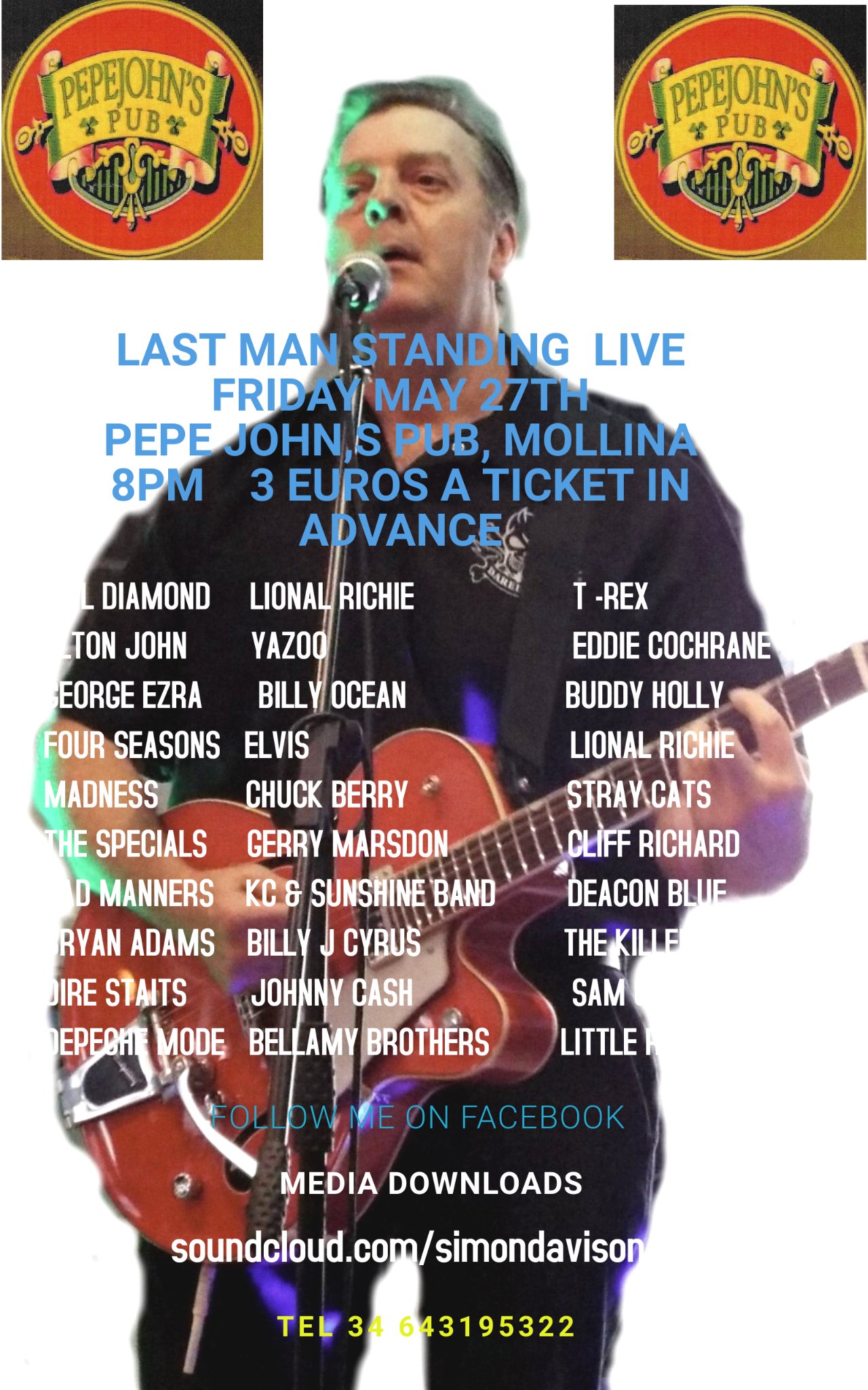 Pepe Johns Irish Pub- Mollina: Live music with Last Man Standing. Friday 27 May 8pm. Avenida El Limonar, 11, 29532 Mollina