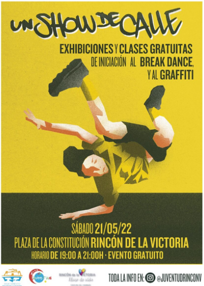 Youth area of Rincón de la Victoria organizes a `Street Show´: Break dance and graffiti exhibitions: Saturday 21 May from 19.00 to 21.00 in the Plaza de la Constitución.
