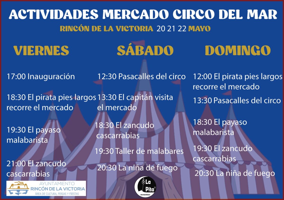 ‘Circus of the Sea’ this weekend with a parade of clowns and pirates at Rincón de la Victoria: The schedule of activities will begin on Friday, May 20 at 5:00 p.m. and will continue until Sunday, May 22, around 11:00 p.m. with fire shows starring circus professionals.