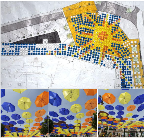 Our Plaza, already known worldwide for its Sombrillas De Colores, is going to become a huge sun and its rays, drawn with yellow and orange umbrellas in the center of the square. The rest, blue umbrellas the color of our sky dotted with some white umbrellas simulating clouds.