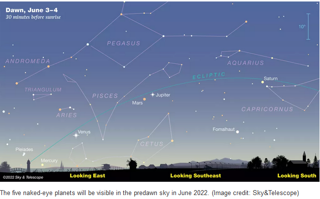 -From left to right in the southeastern predawn sky, you’ll be able to spot Mercury, Venus, Mars, Jupiter and Saturn all in a row. (Mercury will be quite close to the horizon when the show starts June 3 but becomes easier to spot as the month matures. The best opportunity to see the spectacle might come on June 24.)