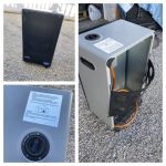 – Coal scuttle. Circa 1930s oak + brass coal scuttle with original shovel. Water mark on the top but generally in good condition. 35 euro.