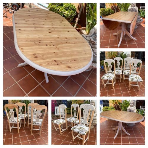 – Table & chairs. (Reduced) For the more adventurous this preloved fabulous quirky unique fun funky table & chairs. Measurements Table 90 x 90 x 74cms Price 340€