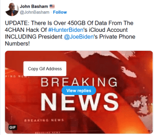 – Senior Editor of Human Events, Jack Posobiec revealed that “4chan has already created (file-sharing) torrents for the Hunter Biden iPhone and iCloud backups and are now seeding them.” So the data is now public and can’t be withdrawn.