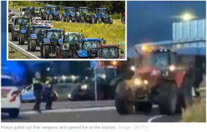 – In the video, a tractor pulls onto the road in the direction of several police vehicles. As the tractor passes the police vehicles, an officer appears to draw his weapon and fire two shots directly into the side of the tractor being driven by a 16 year old boy. Police later confirmed that officers had fired upon tractor-riding protesters but that no one had been injured. Photo: Getty. Full article: https://www.express.co.uk/news/world/1636350/dutch-protest-EU-police-shoot-tractors-dutch-farmers-border-update?s=09 & VIDEO LINK