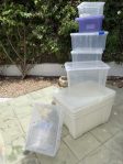 – Plastic storage boxes. Various sizes. 6 x large, 40 cm height x 77 cm length x 55 cm width. 1 x 38.5 height x 55.5 cm x 28 cm. 2 x 17 cm height x 31 cm x 19.5 cm. And 1 x 14 height x 28 cm x 19.5 cm. All with lids. Job lot selling for only 99 euro!