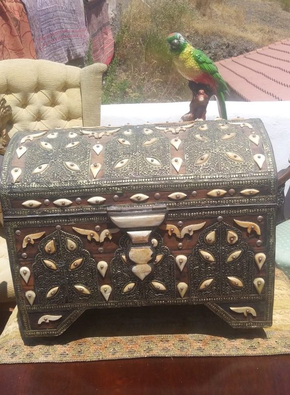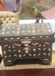 – For Sale: Dome Chest. Eastern dome-top chest made from hardwood with bone decoration and brass trim. Height 34 cm. Width 40 cm. Depth 26 cm. Price 80 euros.