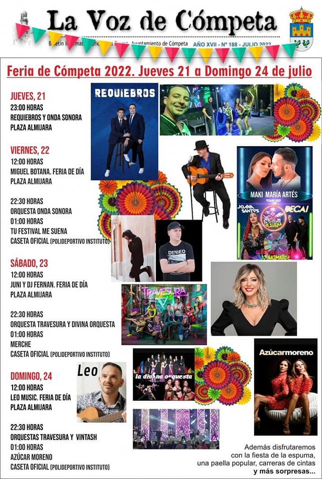 2 Events daily, 12:00 and 22:30. Info- https://www.axarquiacostadelsol.org/evento/cartel-feria-de-competa-2022-del-21-al-24-de-julio/