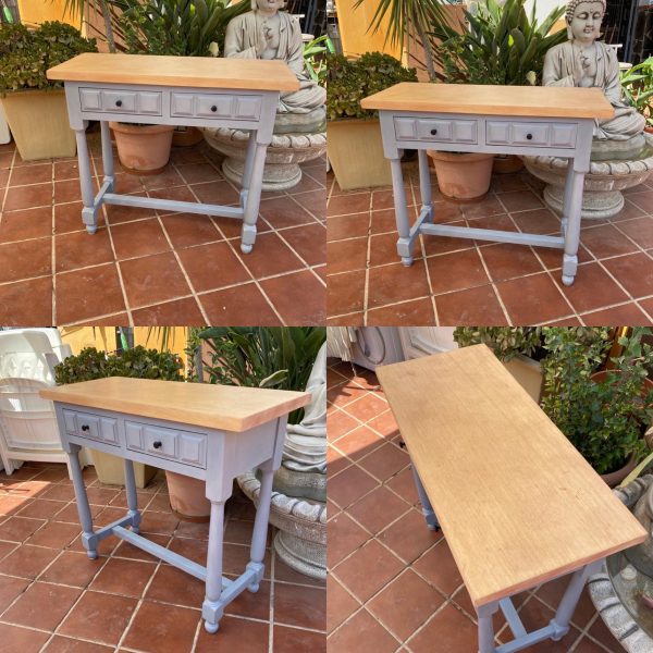 – Writing desk / dressing table. Natural solid top with grey base with 2 drawers. Measurements 85 x 37 x 74cms Price 120€