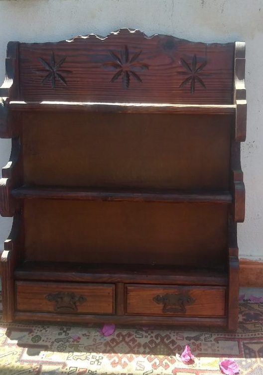 Small attractive pine unit with two drawers and hand carving.