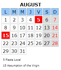 August: Monday August 15th (public holiday, Assumption of Mary)