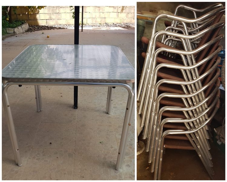 – Terrace tables and chairs sold as a single lot (10 tables 20 chairs) good quality in excellent condition €600, ideal for bar or restaurant.