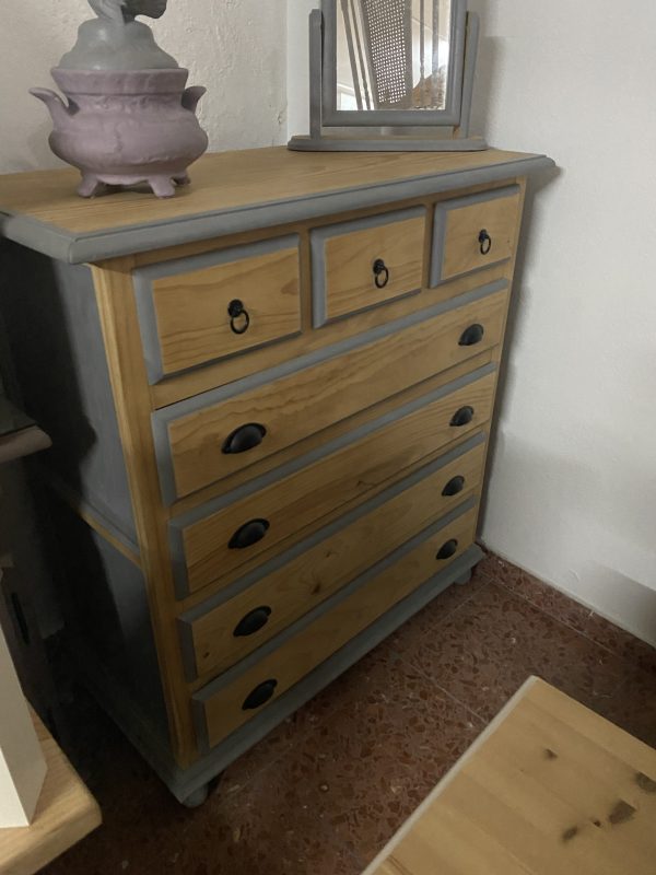 – Good sized chest of drawers Natural & grey New handles Measurements 100 x 48 c 108cms Price 135€