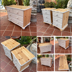 – Solid pine bedroom set. Consists of chest of drawers Natural & yute color; matching bedside units, measurements 85 x 38 x 60cms; Natural & yute Bedside tables measurements 43 x 39 x 60cms. Price 195€ ( for the set )