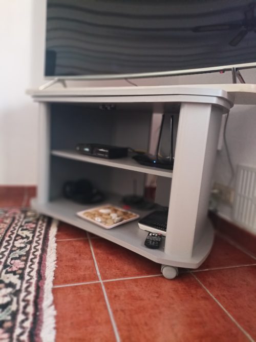 – Corner TV stand with swivel top on casters, 2 shelves below.