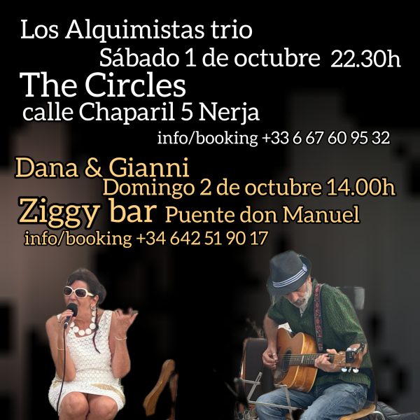 – Los Alquimistas trio Saturday 1 October at 10.30 pm at The Circles, Calle Chaparil 5 Nerja. (Dana Andrews vocals, Gianni Piras acoustic guitar, Uwe Muhlhäuse vocals, guitar, harmonica, flute, percussion)