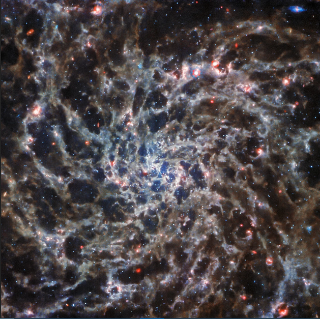 See a spiral galaxy’s haunting ‘skeleton’ in a chilly new space telescope image: Some skeletons are more sparkly than scary. A new image of a far-off galaxy shows us that what lurks underneath a spiral galaxy can be just as spectacular as what our eyes can see. The new images taken by the James Webb Space Telescope’s Mid-InfraRed Instrument (MIRI) show IC 5332, a spiral galaxy about 29,000 light years away from the Earth in the constellation Sculptor. It has a diameter of roughly 66,000 light years, making it slightly larger than our Milky Way galaxy. Photo: NASA. Full article: https://www.popsci.com/science/skeleton-galaxy-james-webb-space-telescope/