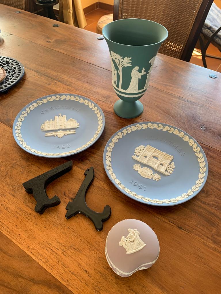 – 2x Blue Wedgewood Christmas plates with stands, 1980 and 1981, €10 each