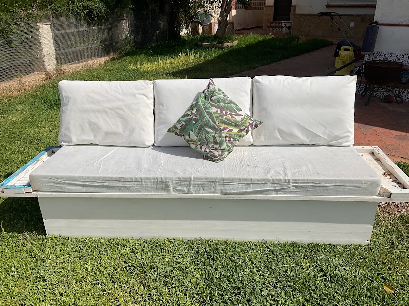 – Garden sofa. We are selling the wooden garden sofa, painted in white. Comes with 3 white back cushions (see photo), and one seating cushion without cover (but in good condition). Measurements wide in total 2.20m, seating area 1.80m