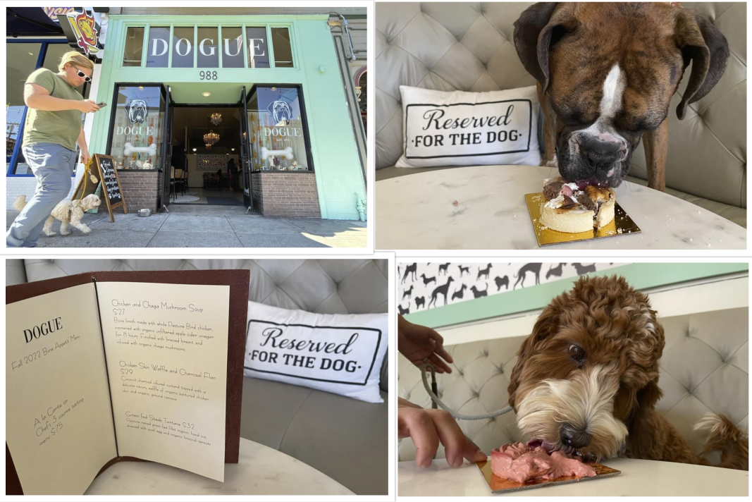 – Dogue, which rhymes with vogue, opened last month in the city’s trendy Mission District. For $75 dollars per pup, doggie diners get a multiple-course “bone appetite” meal featuring dishes like chicken skin waffles and filet mignon steak tartare with quail egg.