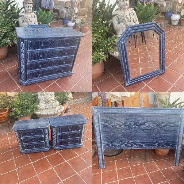 – Complete bedroom set. Mirror 63 x 80cms, Headboard 151 x 107cms, Chest of drawers 99 x 42 x 78cms, Bedside tables 60 x 36.50 x 51cms. Price 90€ ( for the complete set ). contact Jackie /nerja 672170429