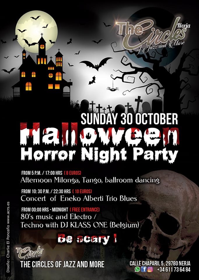 This weekend the concert of Eneko Alberti Blues Trio that was scheduled on Saturday will take place on Sunday at 22h30. We will join it with a Milonga and ballroom dancing animated by Miguel Ojos Negros in the afternoon at 17h and at midnight with the intervention of Dj Klass one (Belgium) to celebrate a big Halloween party. Vampires, witches, zombies and other despicable characters are welcome at The Circles. C/ Chaparil 5 Nerja