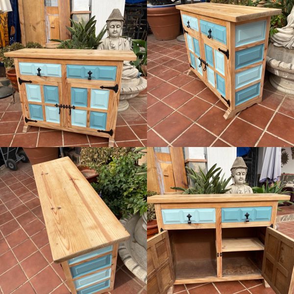 – Natural solid wooden sideboard with spearmint & turquoise colour paint measurements 110 x 36 x 82cms Price 145€