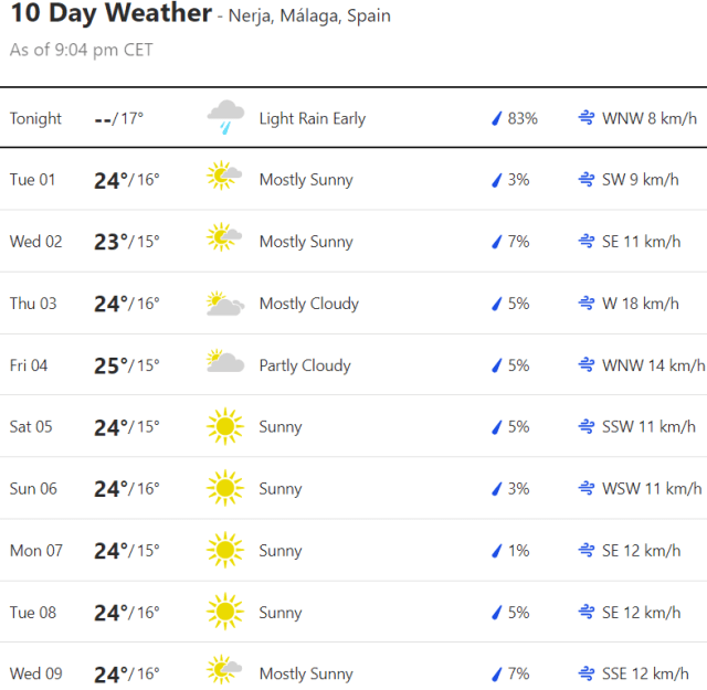 Local Weather: https://www.accuweather.com/en/es/torre-del-mar/306652/weather-forecast/306652